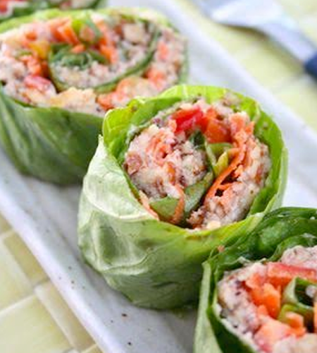 Se colocan las hojas de lechugas una sobre otra y se agrega una cucharada de la pasta con frutos secos y luego los pimentones y verduras picadas, una vez realizado este proceso se enrolla formando un cilindro largo. Los Rolls se cortan de unos 4 o 5 cms e ancho cada uno.